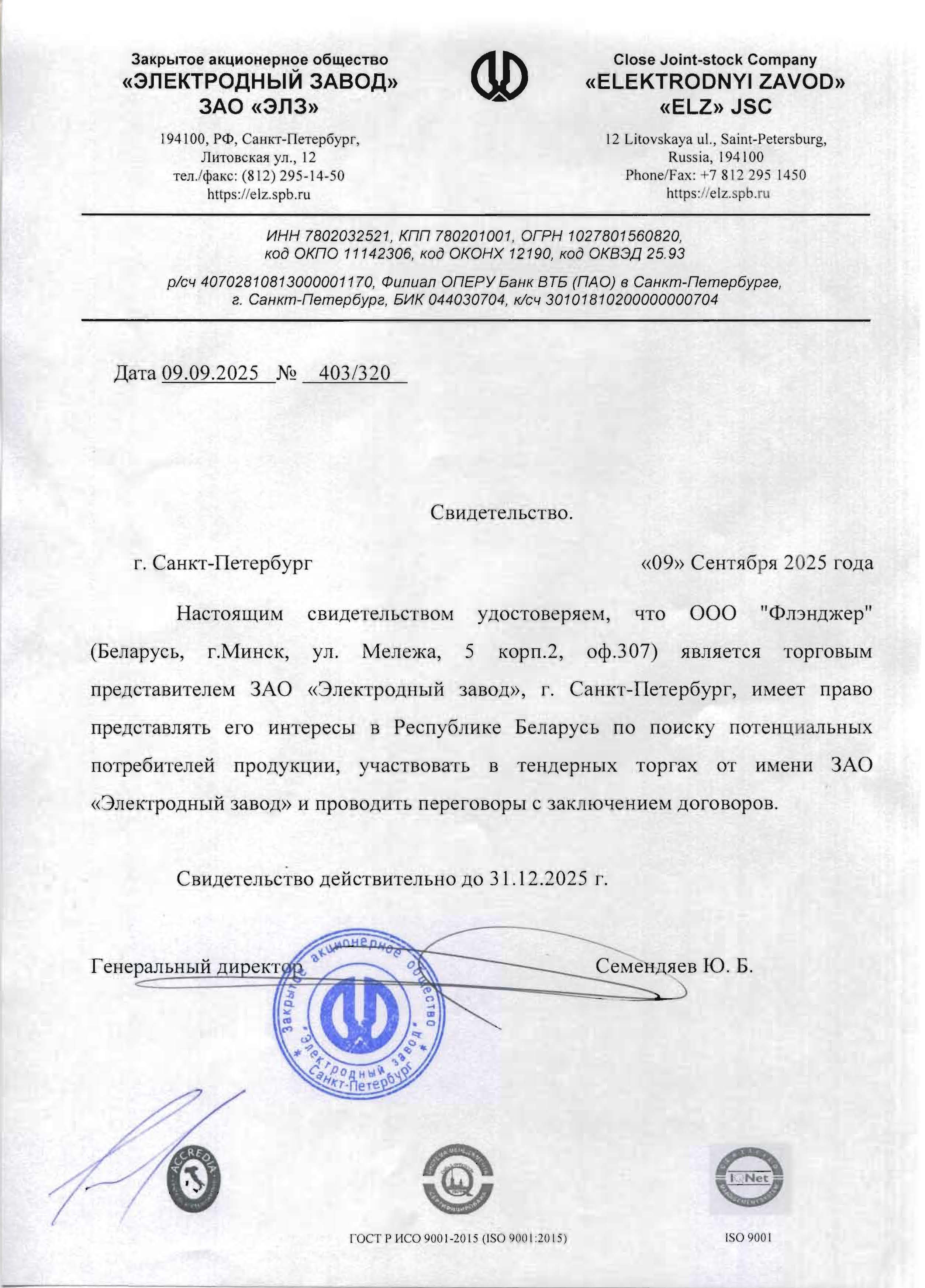 ООО "Флэнджер" аккредитовано на ОАО «Белорусская универсальная товарная биржа».